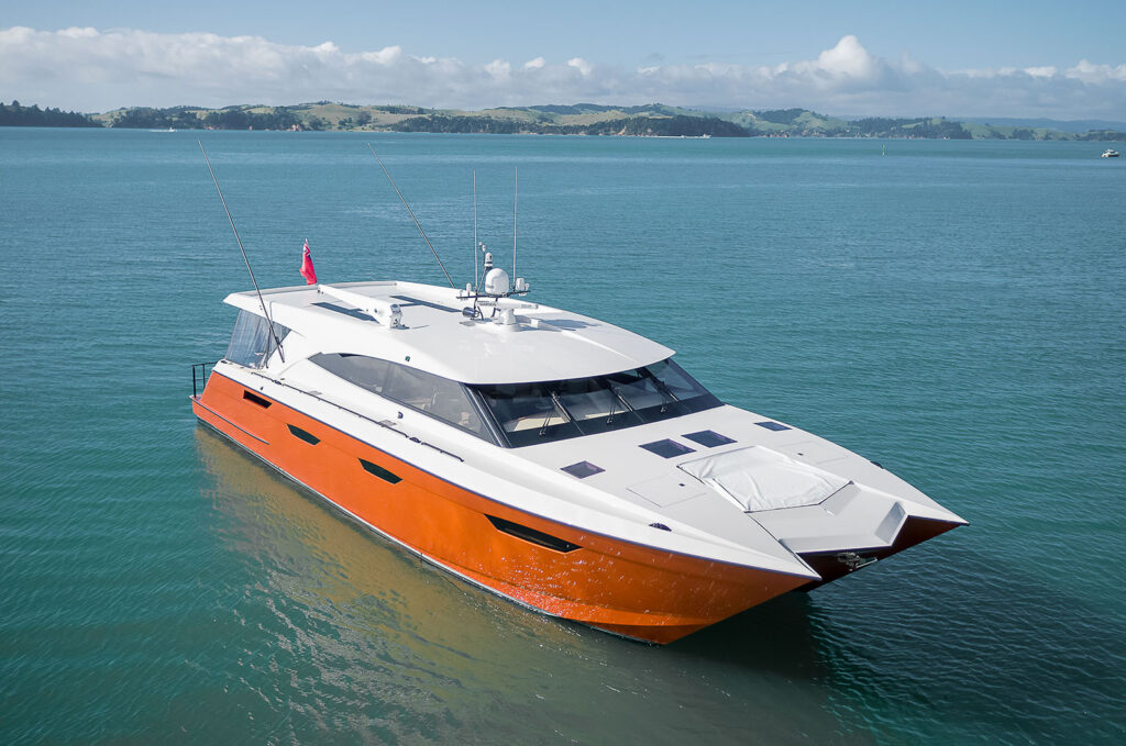 In 2019, Kiwi born and bred international offshore powerboat winning champion Wayne Valder decided he wanted a luxury Powercat, he set his sights on something fast, extremely fast. Wayne set out to assemble a team of New Zealand’s leading experts in the marine industry. His quest took him to one of the world’s foremost designers of high-performance pleasure cats, Roger Hill. With the design drafted, he approached Scott Lane Boat Builders, who have built a reputation for producing high-quality handcrafted motor yachts.